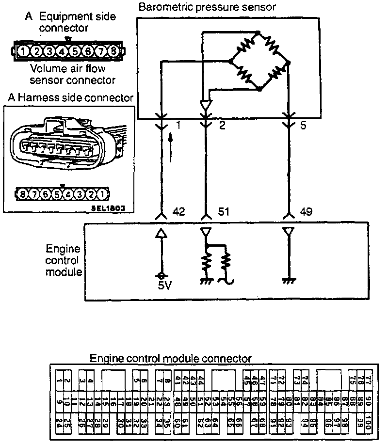 - The 5 V power supply within the engine control module is supplied to the barometric pressure sensor; it passes through the circuitry within the sensor, and is grounded at the engine control module.