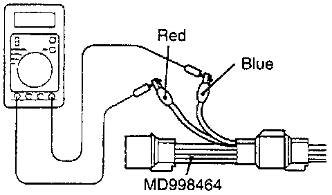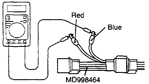 (2) Check that there is continuity between terminal (1) (red clip of the special tool) and terminal (3) (blue clip) of the heated oxygen sensor connector [approx. 11 - 18 Ohms at a temperature of 20°C (68°F)].
