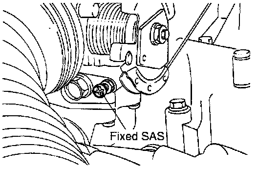 (4) Turn the fixed SAS clockwise slowly to find a point at which it contacts the throttle lever (where the throttle valve starts opening). From that point, tighten the fixed SAS further 1 1/4 turns.