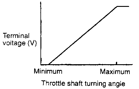 - When the throttle valve shaft is rotated all the way from the idling position to the fully open position, the resistance between the throttle position sensor's variable-resistance terminal and the ground terminal also increases in accordance with that rotation, and, as a result, the voltage of the throttle position sensor's variable-resistance terminal also becomes higher in accordance with that rotation.