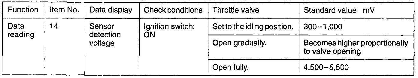 If the voltage of the throttle position sensor is outside the standard value, check once again after making the throttle position sensor adjustment. In addition, if there are any indication that the fixed SAS has been moved, adjust the fixed SAS.