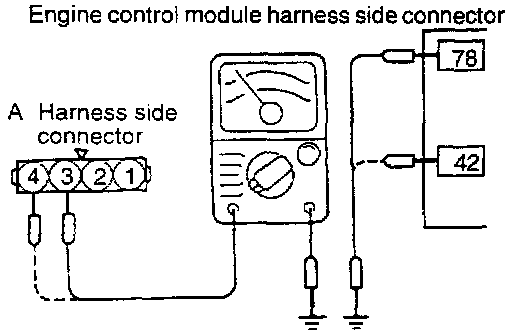 (3) Connect a pointer type ohmmeter between terminal (1) (sensor ground) and terminal (3) (sensor output).