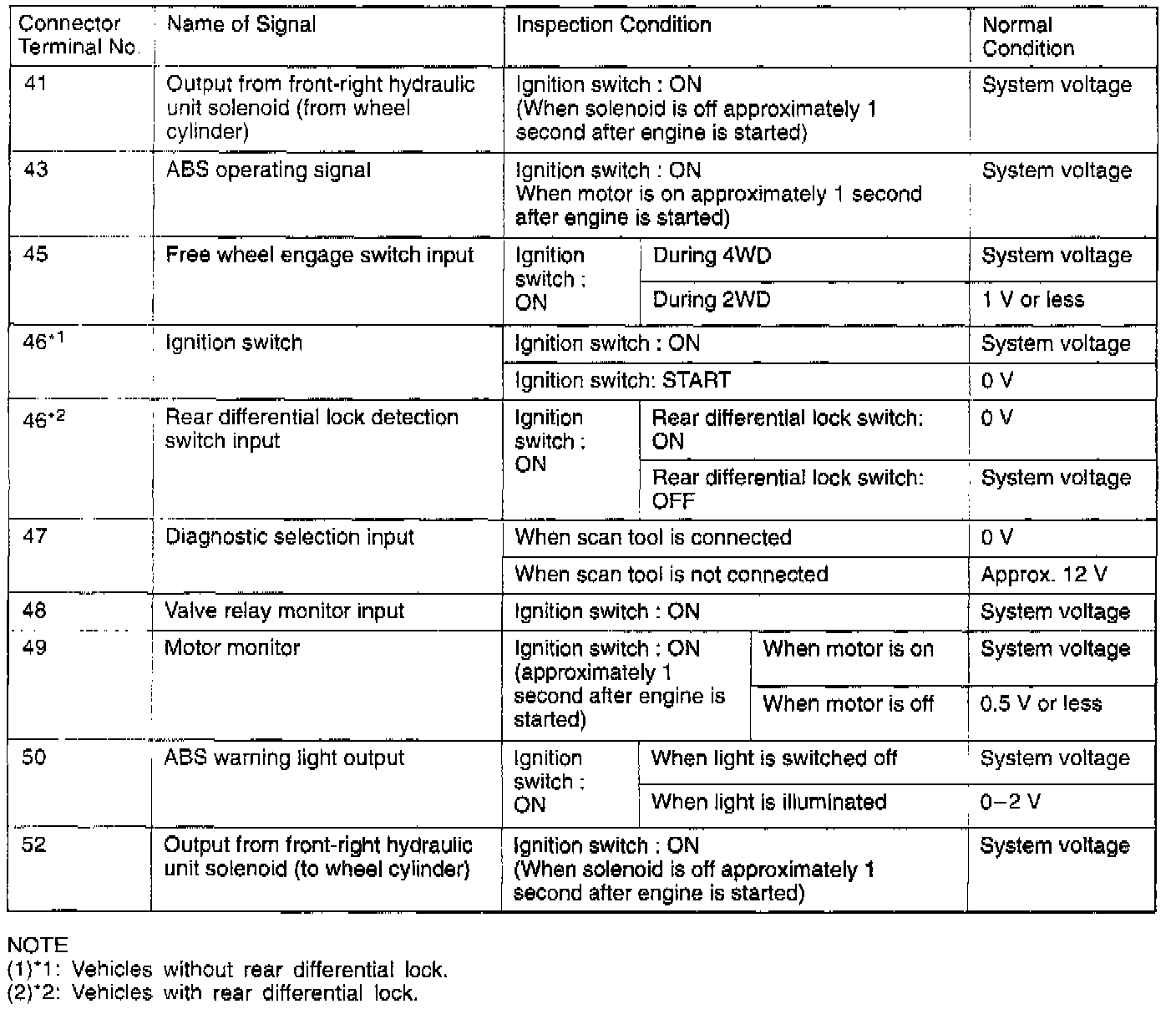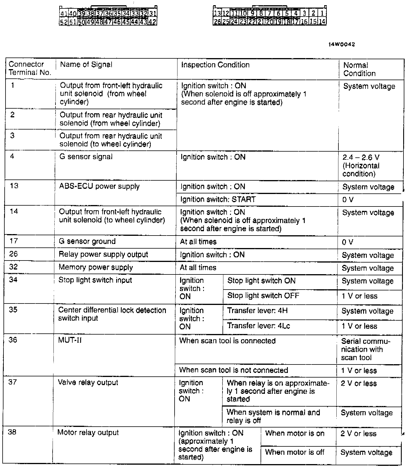 TERMINAL VOLTAGE CHECK CHART1. Measure the voltages between terminals (12), (25) and (42) (ground terminals) and each respective terminal.