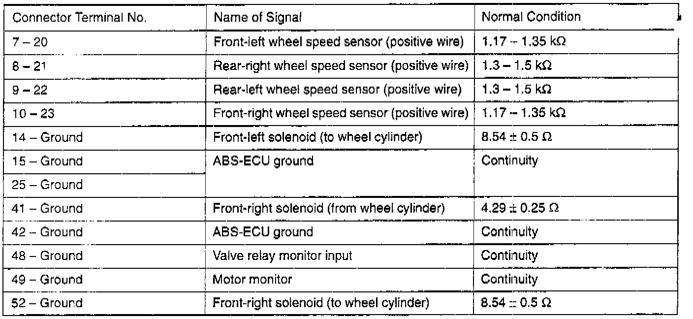 1. Turn the ignition switch off and disconnect the ABS-ECU connector before measuring resistance and checking continuity.