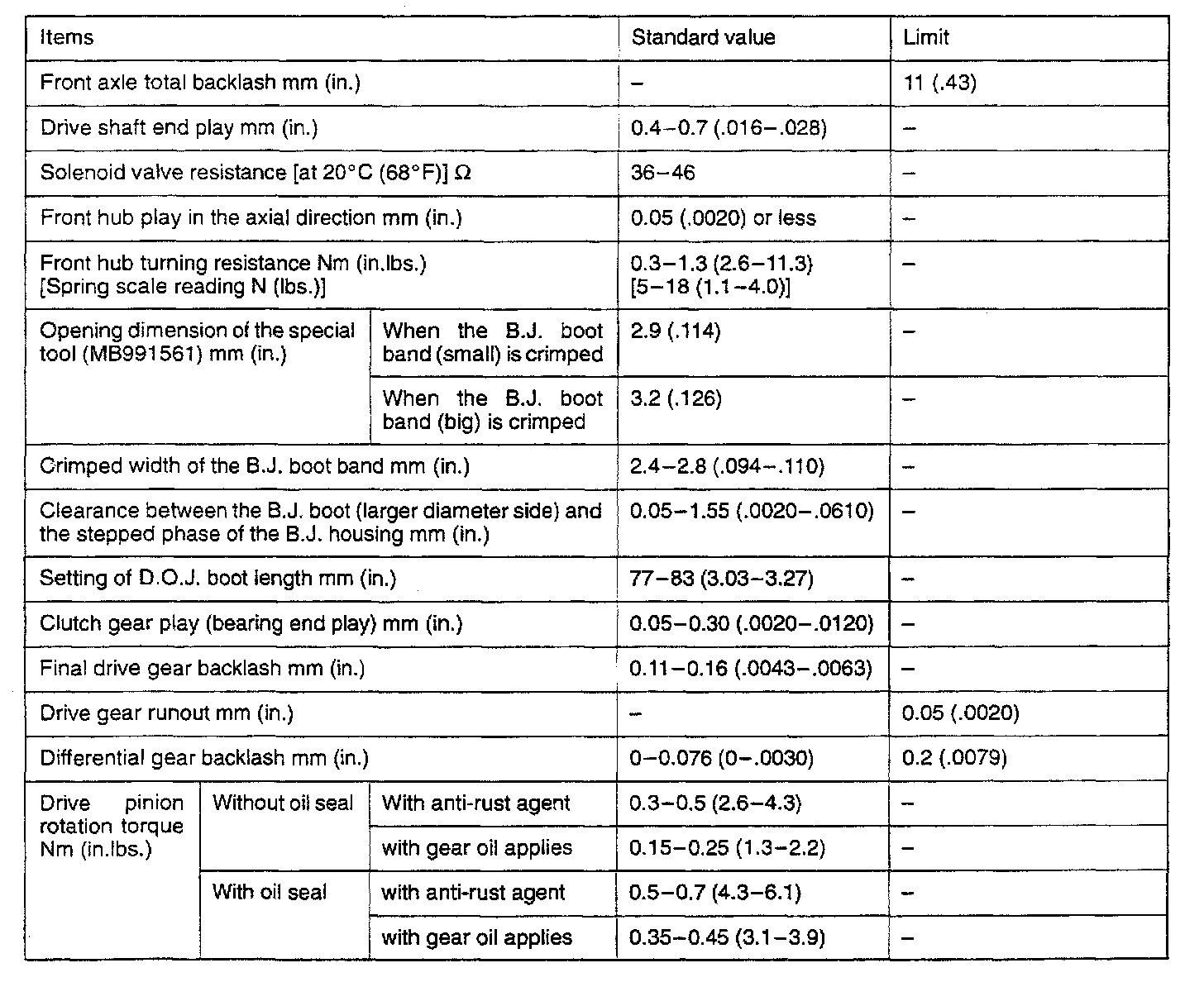4WD Front Differential Standard Values & Limits: