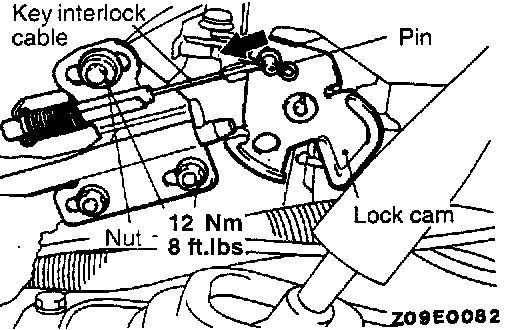 5) Gently push the lock cam until the pin stops in the direction of the arrow mark as shown in the illustration, and then tighten the nut to the specified torque to clamp the key interlock cable.