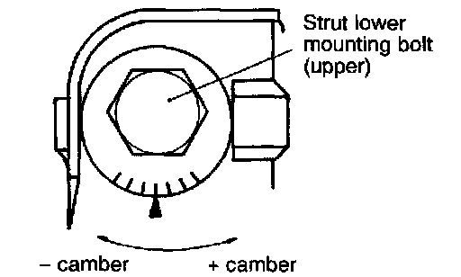 To adjust camber, turn the strut lower mounting bolt (upper). One graduation is equivalent to about 20' in camber. Caster has been factory-adjusted to the standard value and requires no adjustment.