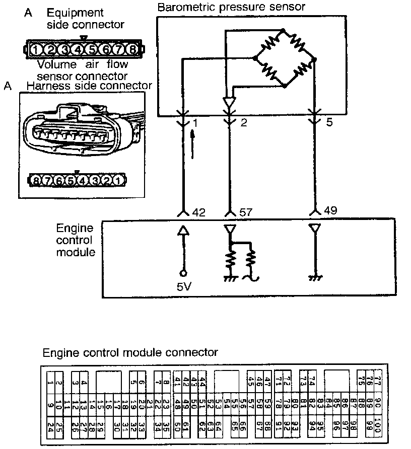 - The 5 V power in the engine control module is supplied to the barometric pressure sensor. Through the circuit in the sensor, it is grounded in the engine control module.