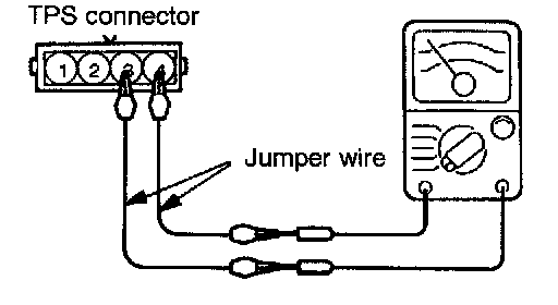 b. Using jumper wires, connect an Ohmmeter across terminal (3) (closed throttle position switch) and terminal (4) (sensor ground) of the throttle position sensor.