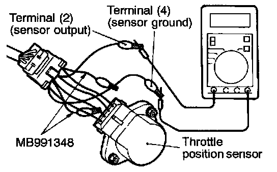 b. Connect a digital voltmeter between the throttle position sensor terminal (2). (sensor output) and terminal (4) (sensor ground).
