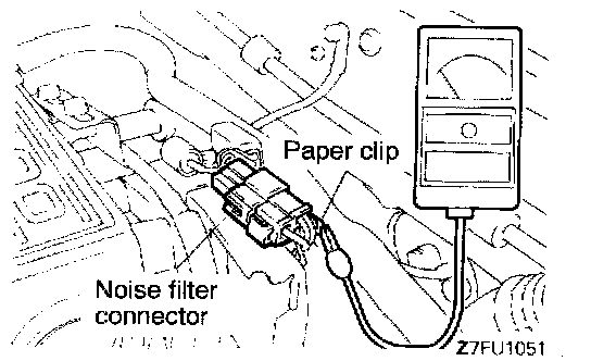 2. Insert a paper clip to the noise filter connector, and connect a tachometer to the paper clip.