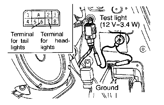 2. Keeping the connector connected to the light automatic shut-OFF unit, connect the test light (12 V - 3.4 W) from the harness side to terminal No.6 (for tail lights) or No.7 (for headlights). Under the following conditions, check the operation of the test light.