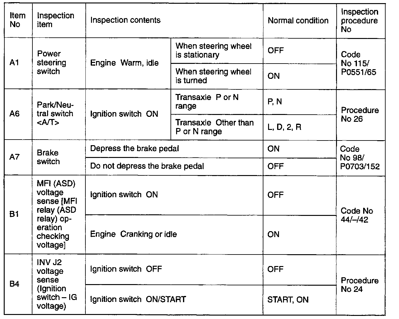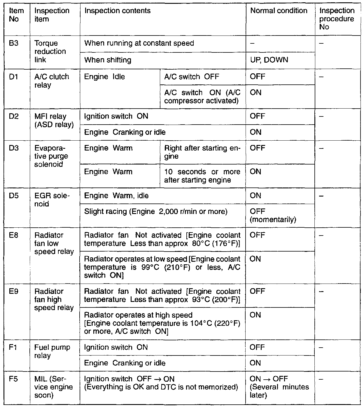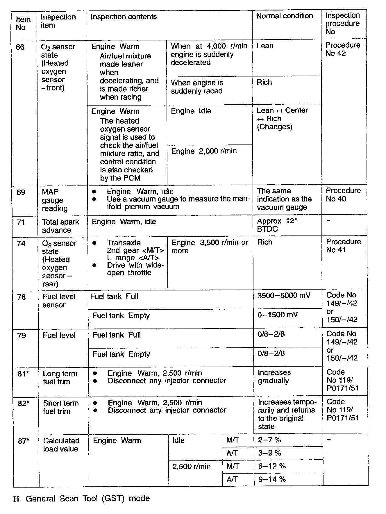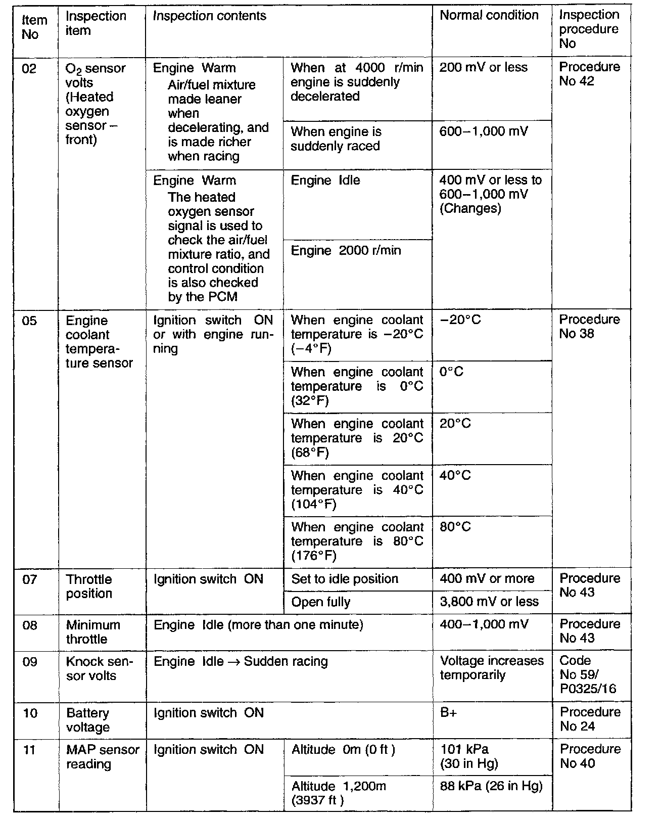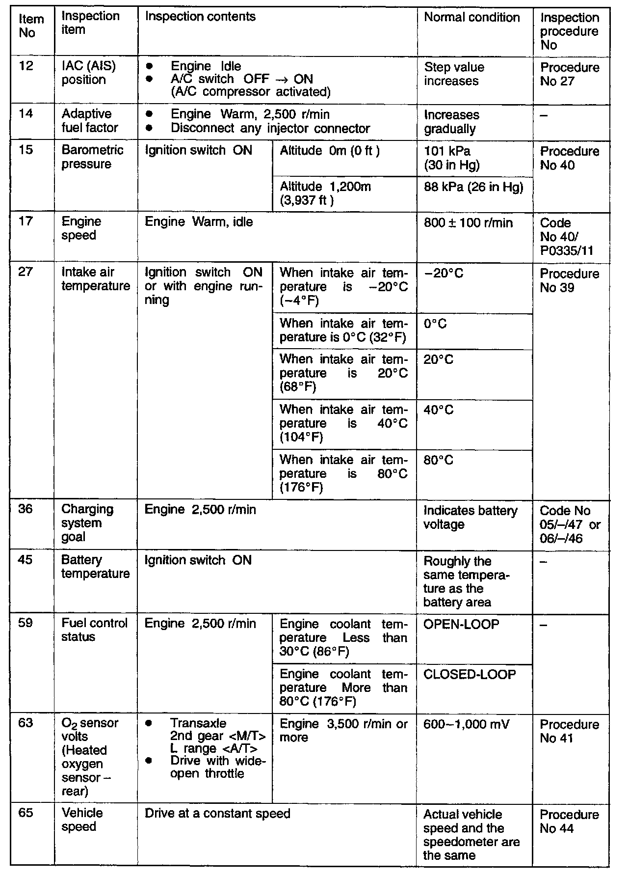 SENSOR READ TESTS (DATA LIST) REFERENCE TABLE