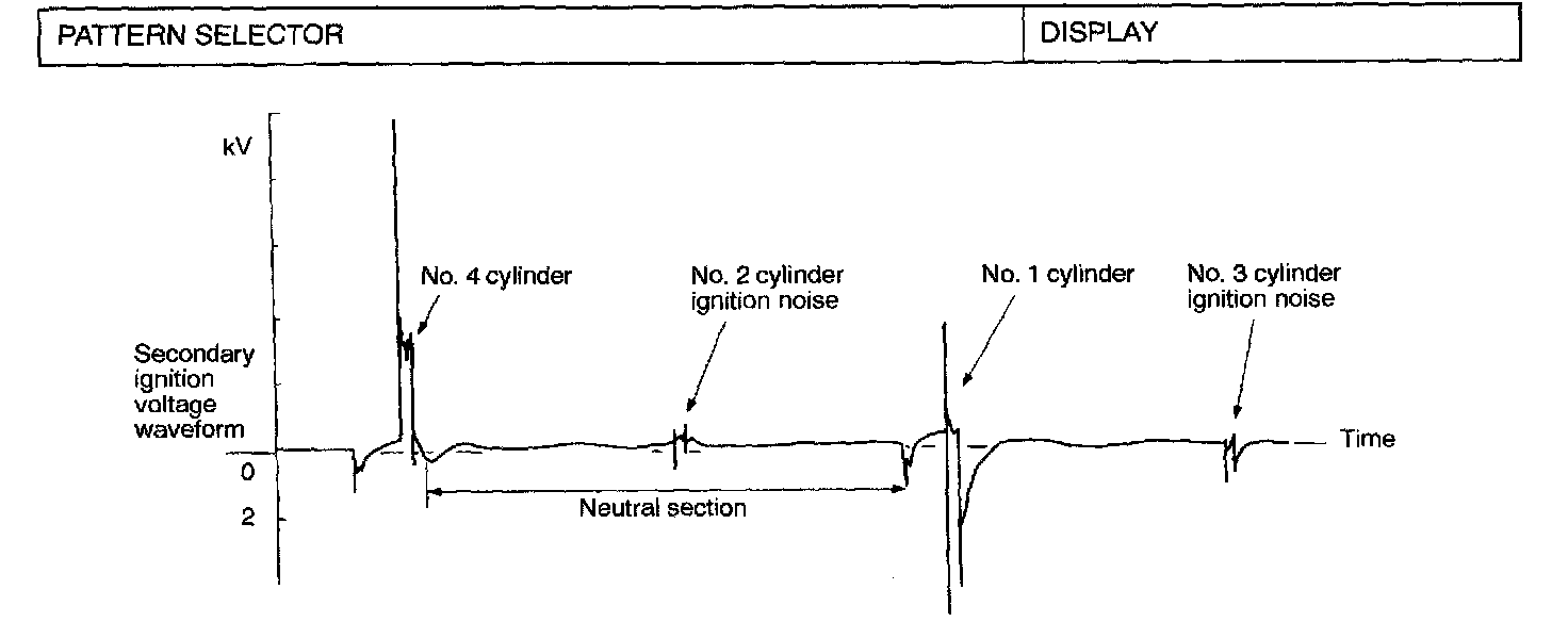 2. Because of the two-cylinder simultaneous ignition system, the waveforms for two cylinders in each group appear during waveform observation (No.1 cylinder - No.4 cylinder, No.2 cylinder - No.3 cylinder). However, waveform observation is only applicable for the cylinder with the spark plug cable clamped by the secondary pickup.
