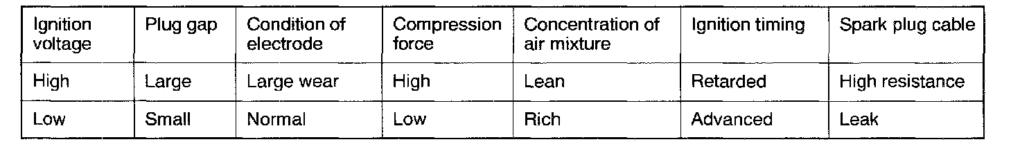 The height, length and slope of the spark line (refer to abnormal waveform examples 1, 2, 3 and 4) show the following trends.