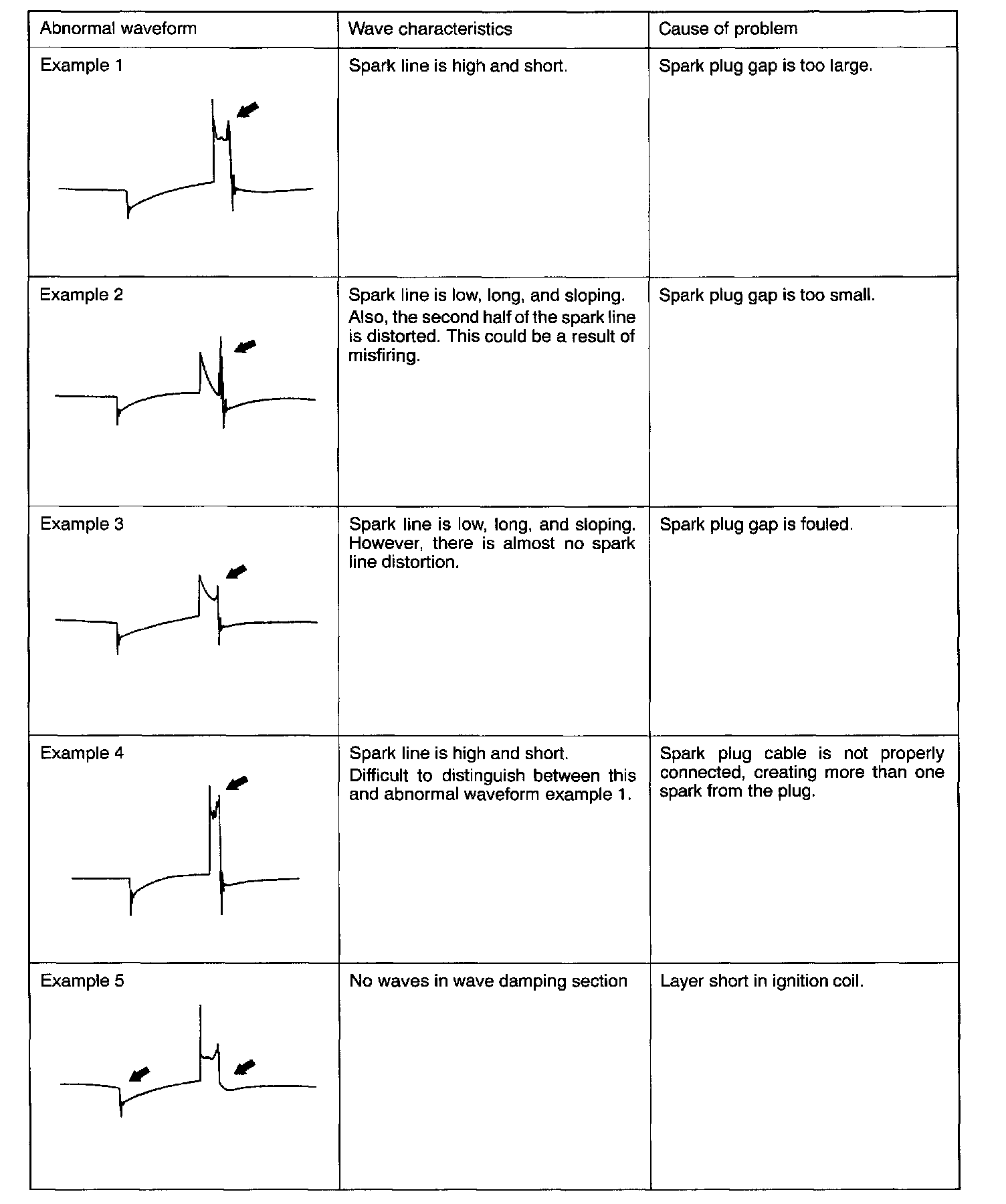 1. The peak ignition voltage will be reversed when the spark cables No.2 and No.4, or No.1 and No.3 cylinders are clamped.
