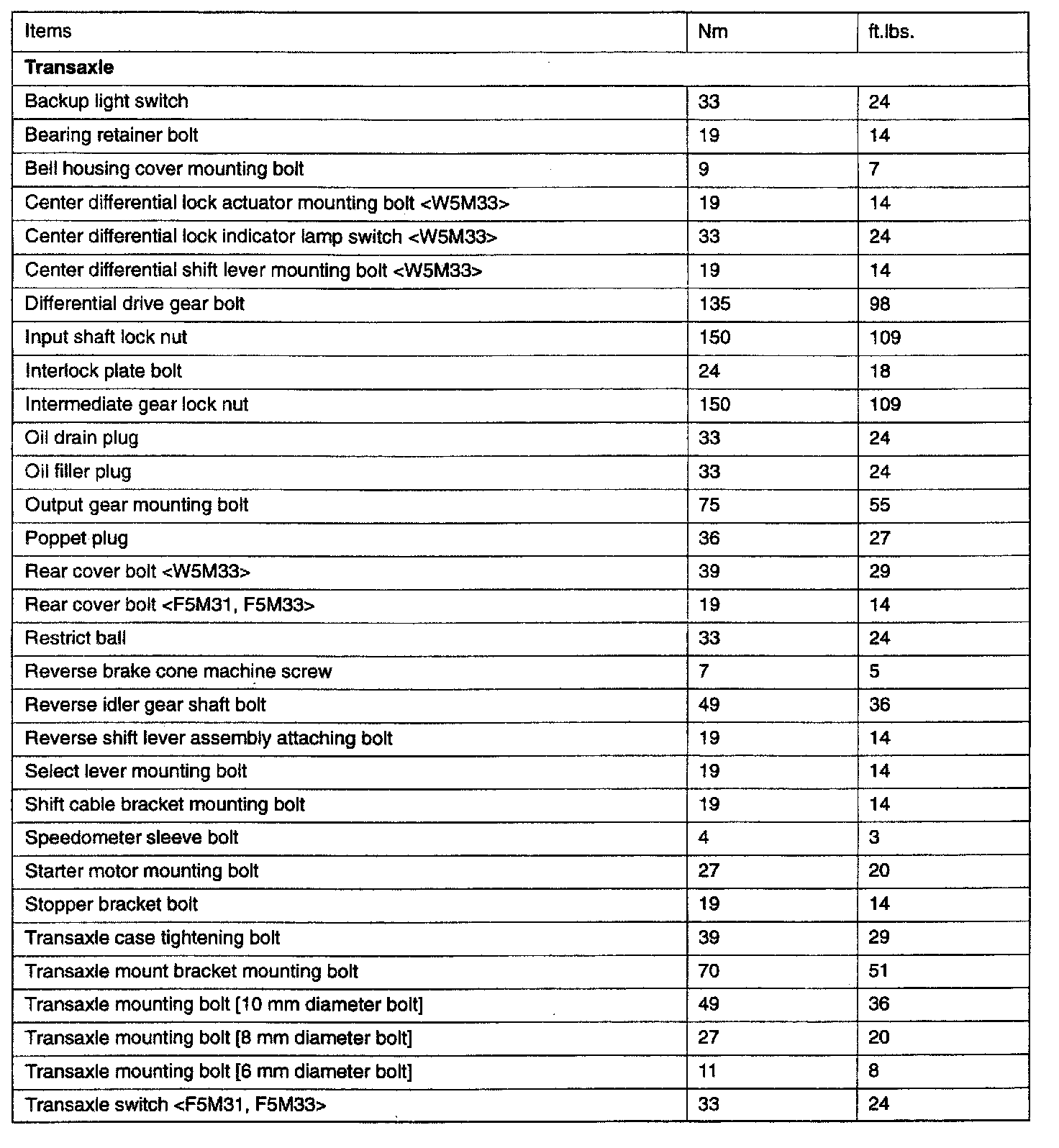 F5M31/F5M33/W5M33 5-spd M/T, Transaxle Torque: