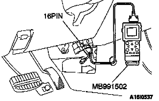 CAUTION: To prevent damage to scan tool MB991502, always turn the ignition switch to "LOCK" (OFF) position before connecting or disconnecting scan tool MB991502.