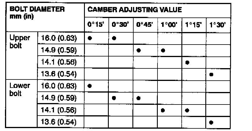 1. Estimate how much additional camber adjustment is required. Using the table below, select the camber adjusting bolt, and then replace the knuckle and strut assembly connection bolts (upper bolt, lower bolt) with the selected bolts.