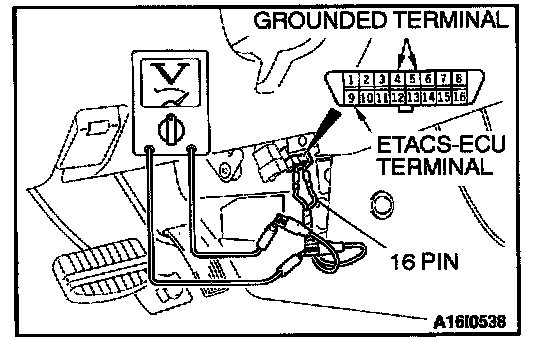 1. Connect special tool MB991529 to connect a voltmeter between grounded terminal 4 or 5 and ETACS-ECU terminal 9 of the 16 pin data link connector.