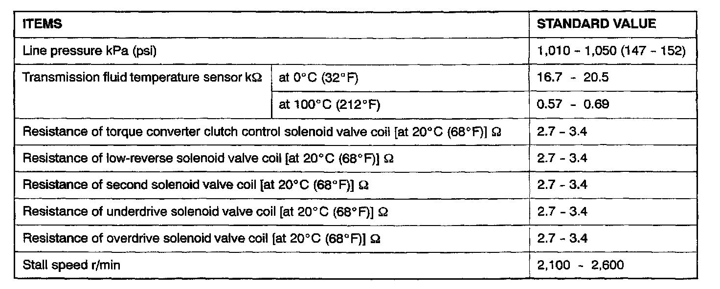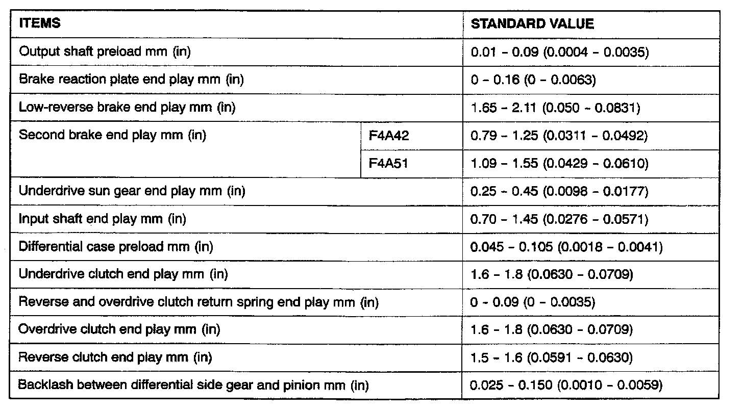 F4A42/F4A51 4-spd A/T, Standard Values:
