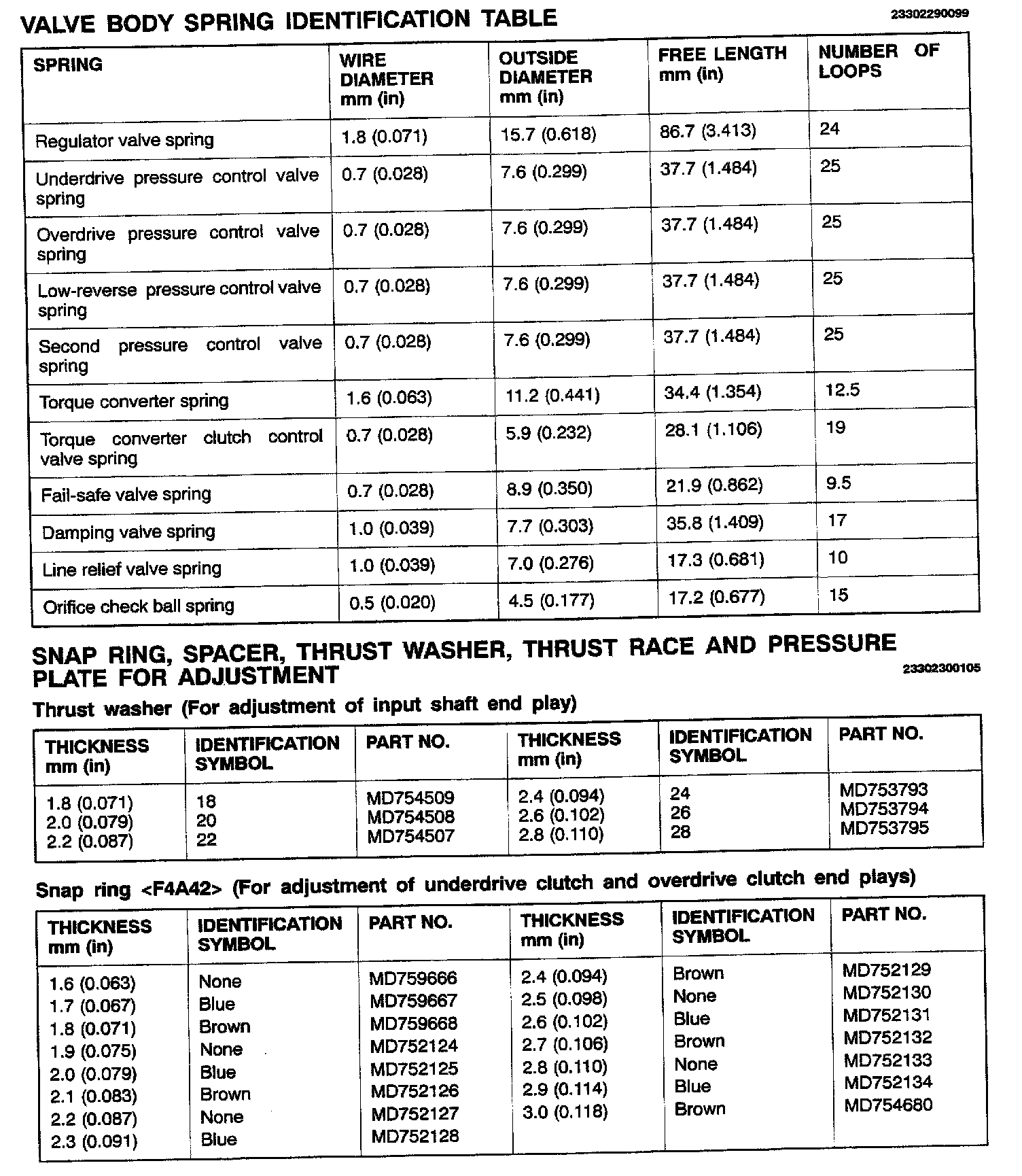 F4A42/F4A51 4-spd A/T, Spring Chart & Input Shaft/Clutch End Play: