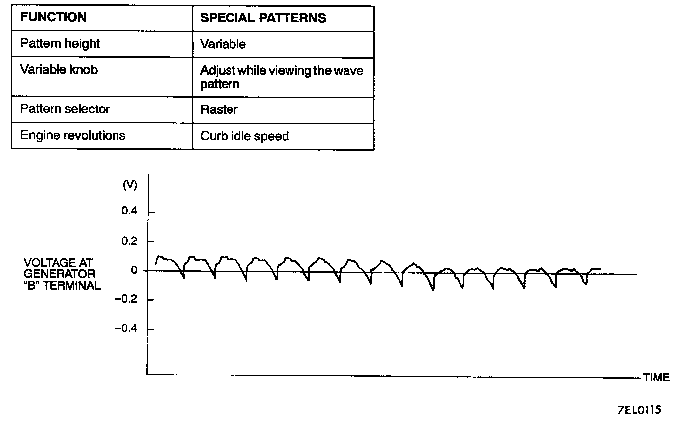 NOTE: The voltage waveform of the generator "B" terminal can undulate as shown at left. This waveform is produced when the regulator operates according to fluctuations in the generator load (current), and is normal for the generator. If the ripple height is abnormally high (approximately 2 V or more during idling), the wires between the generator B terminal and the battery have broken due to fuse blowing, etc. The generator is usually operating properly