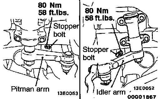 2. If the steering angle is outside the standard value, check the toe-in, and then adjust the steering angle with the stopper bolt.