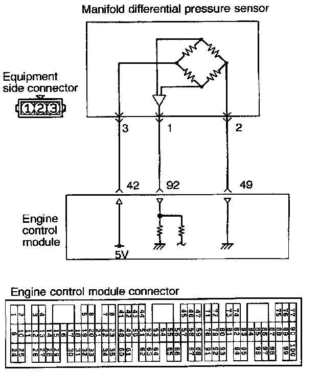- 5 V of power is supplied to the manifold differential pressure sensor from the engine control module, and the sensor circuit ground is located in the engine control module.