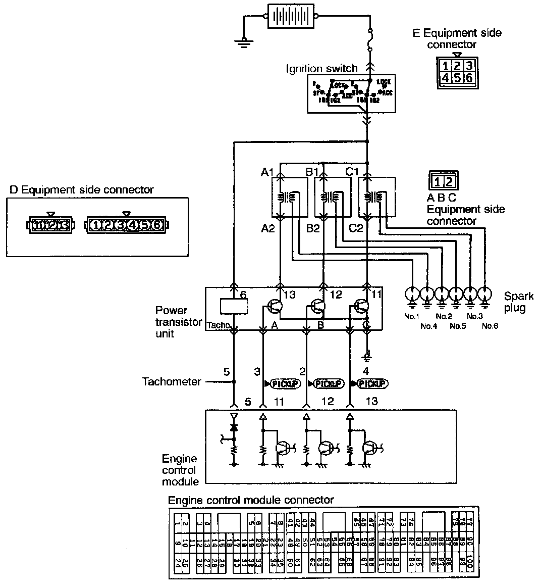 - When the ignition power transistor unit A is turned on by the signal from the engine control module, primary current flows to the ignition coil A. When the ignition power transistor unit A is turned off, the primary current is shut off and a high voltage is induced in the secondary coil A, causing the ignition plugs of No.1 and No.4 cylinders to spark. When the ignition power transistor unit B is turned oft, the ignition plugs of No.2 and No.5 cylinder spark. In addition, when the ignition power transistor unit C is turned off, the ignition plugs of No.3 and No.6 cylinders spark.