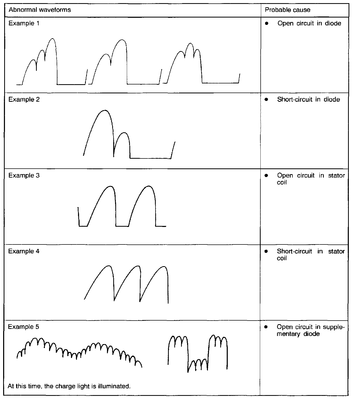 2. Identification of abnormal waveforms is easier when there is a large output current (regulator is not operating). (Waveforms can be observed when the headlights are illuminated.)