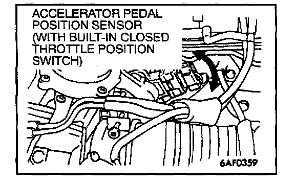 4. Loosen the accelerator pedal position sensor mounting bolt; then turn the accelerator pedal position sensor body counter clockwise as far as it will go.