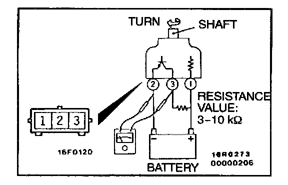 2. Turn the shaft of the vehicle speed sensor and check to be sure that there is voltage between terminals 2 - 3.(1 turn = 4 pulses)