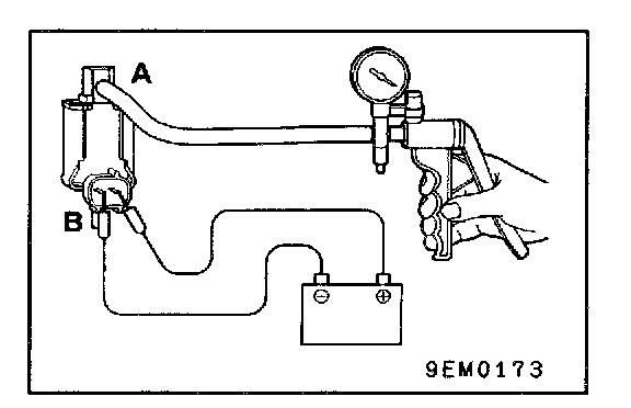 3. Connect a hand vacuum pump to nipple (A) of the EGR solenoid. (Refer to the illustration at left.)