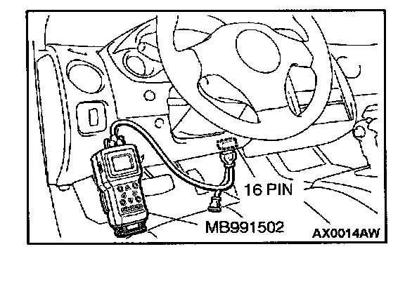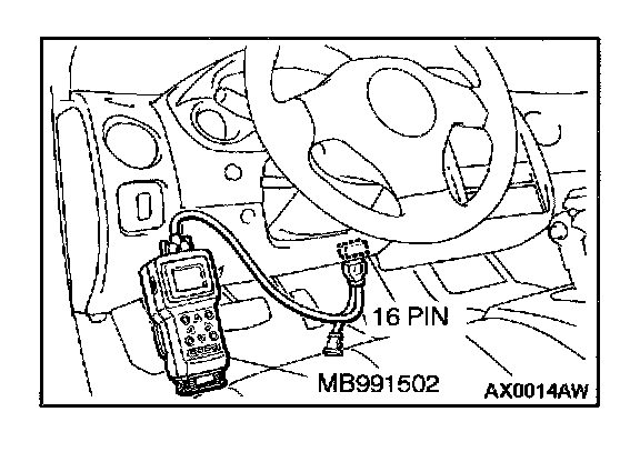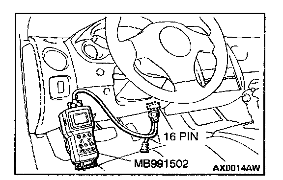 CAUTION: To prevent damage to scan tool MB991502, always turn the ignition switch to "LOCK" (OFF) position before connecting or disconnecting scan tool MB991502.