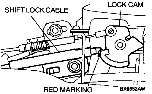 2. Fasten the shift lock cable at the position where the end of the shift lock cable is positioned above the red marking.