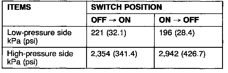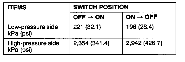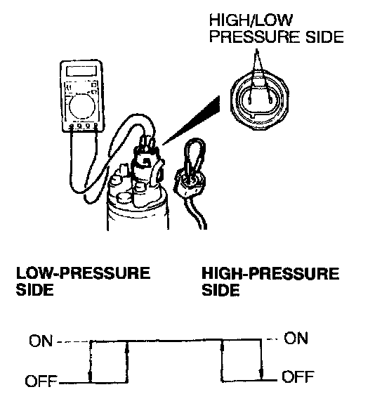 3. When the high/low pressure sides of the dual pressure switch are at operation pressure (ON) and there is continuity between the respective terminals, then the condition is normal. If there is no continuity, replace the switch.