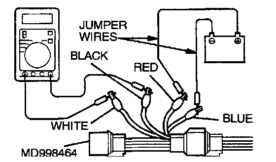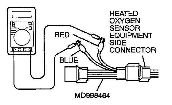 1. Disconnect the heated oxygen sensor connector and connect special tool MD998464 to the connector on the heated oxygen sensor side.