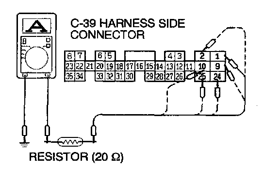 4. Connect the terminals 1, 2, 9, 10, 24 and 25 to ground via a 20 Ohm resistor. Measure the current at this time. The PCM terminals correspond to the injectors as follows.