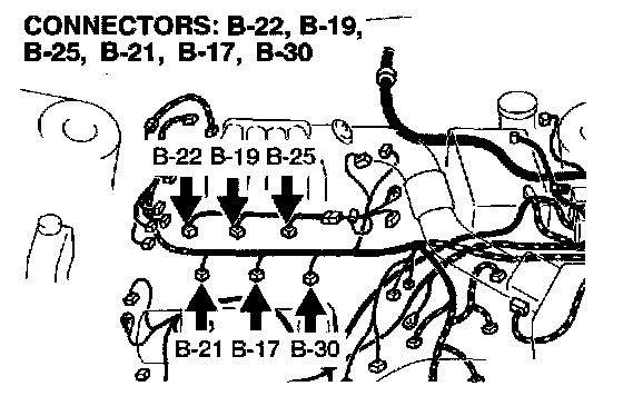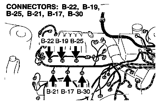 STEP 10. Check the harness connectors B-17, B-19, B-21, B-22, B-25, B-30 at the injector for damage.