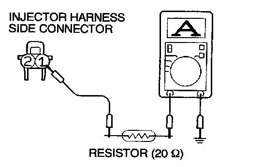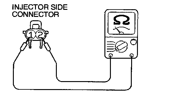 2. Measure the resistance between each injector side connector terminals 1 and 2.