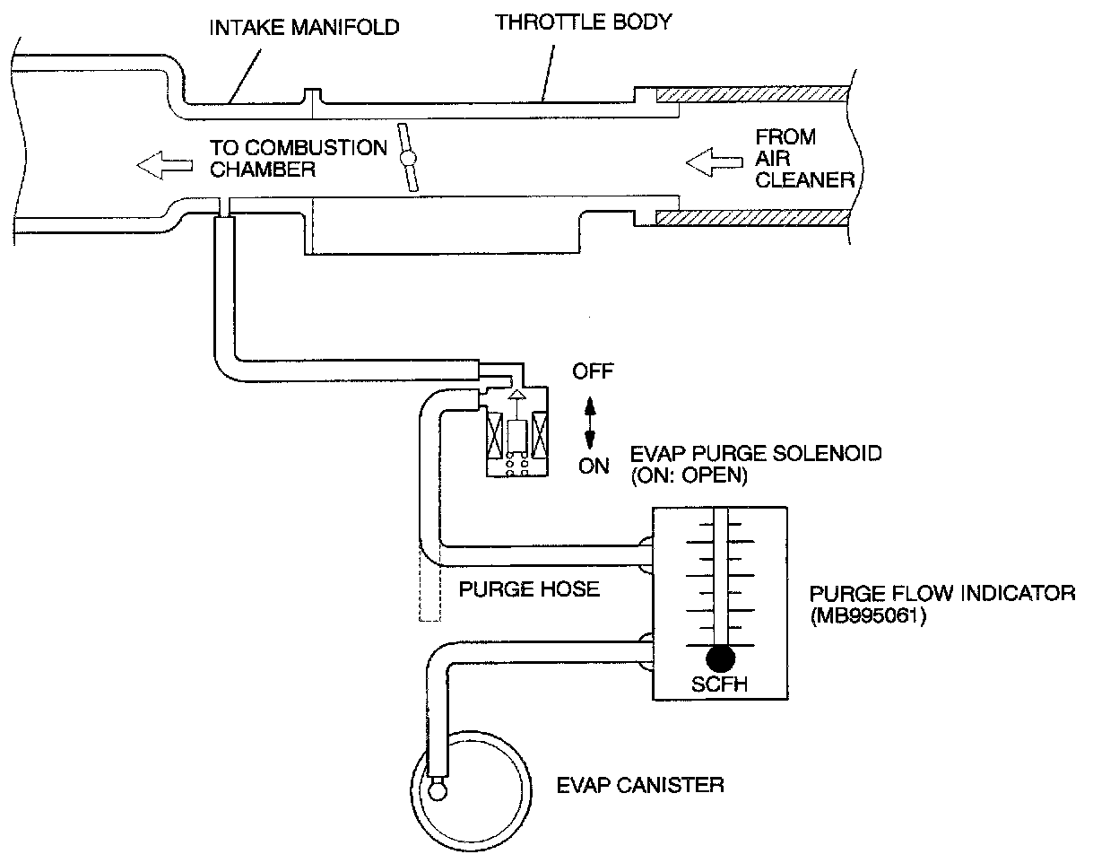 1. Disconnect the purge hose from the evaporative emission (EVAP) canister, and connect the special tool MB995061 between the EVAP canister and the purge hose.