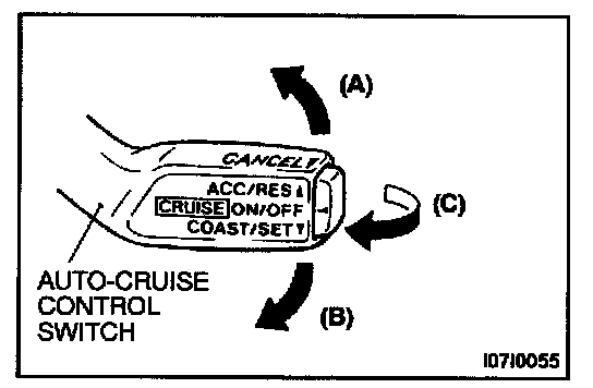 1. Set to the desired speed.2. Push the auto-cruise control switch in the direction of arrow (B).