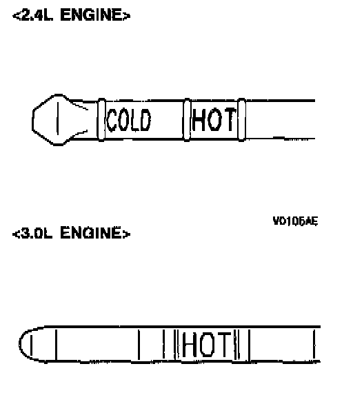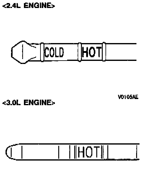 5. Check that the A/T fluid level is at the "HOT" mark on the dipstick. If the A/T fluid level is lower than this, pour in more DIAMOND ATF SP-II, DIAMOND ATF SP-II M or equivalent until the level reaches the "HOT" mark.