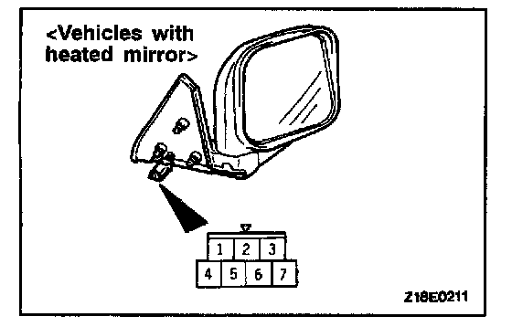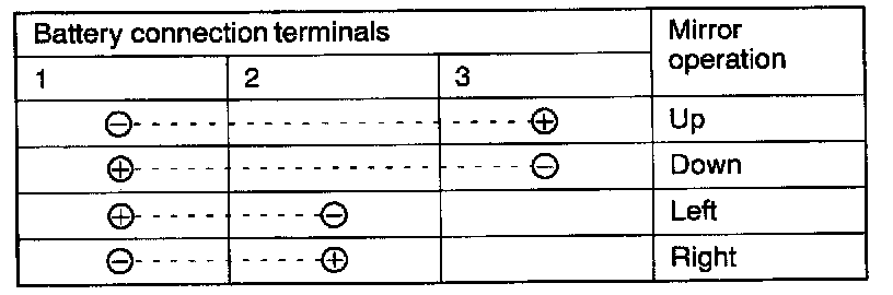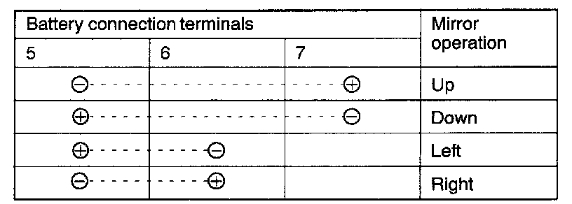 1. Check to be sure that the mirror moves as described in the table when each terminal is connected to the battery.