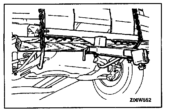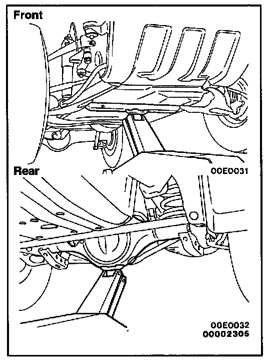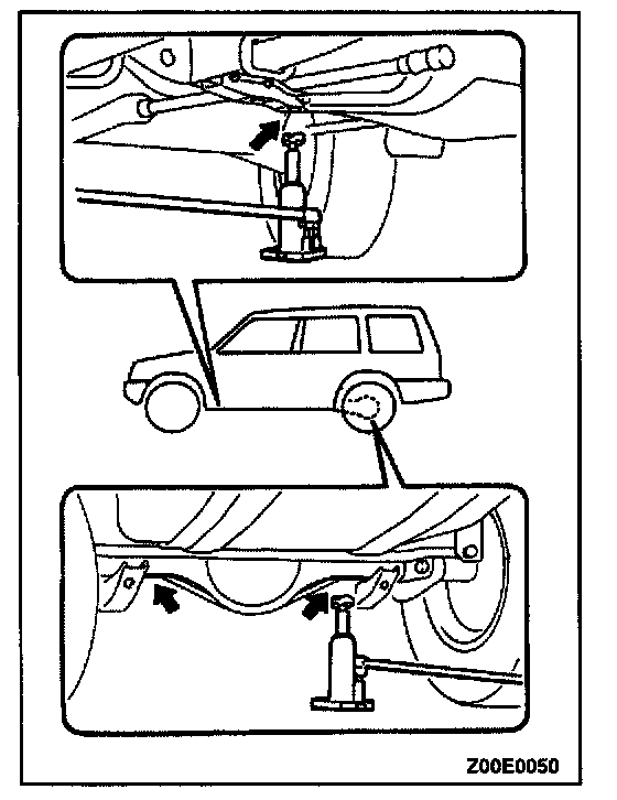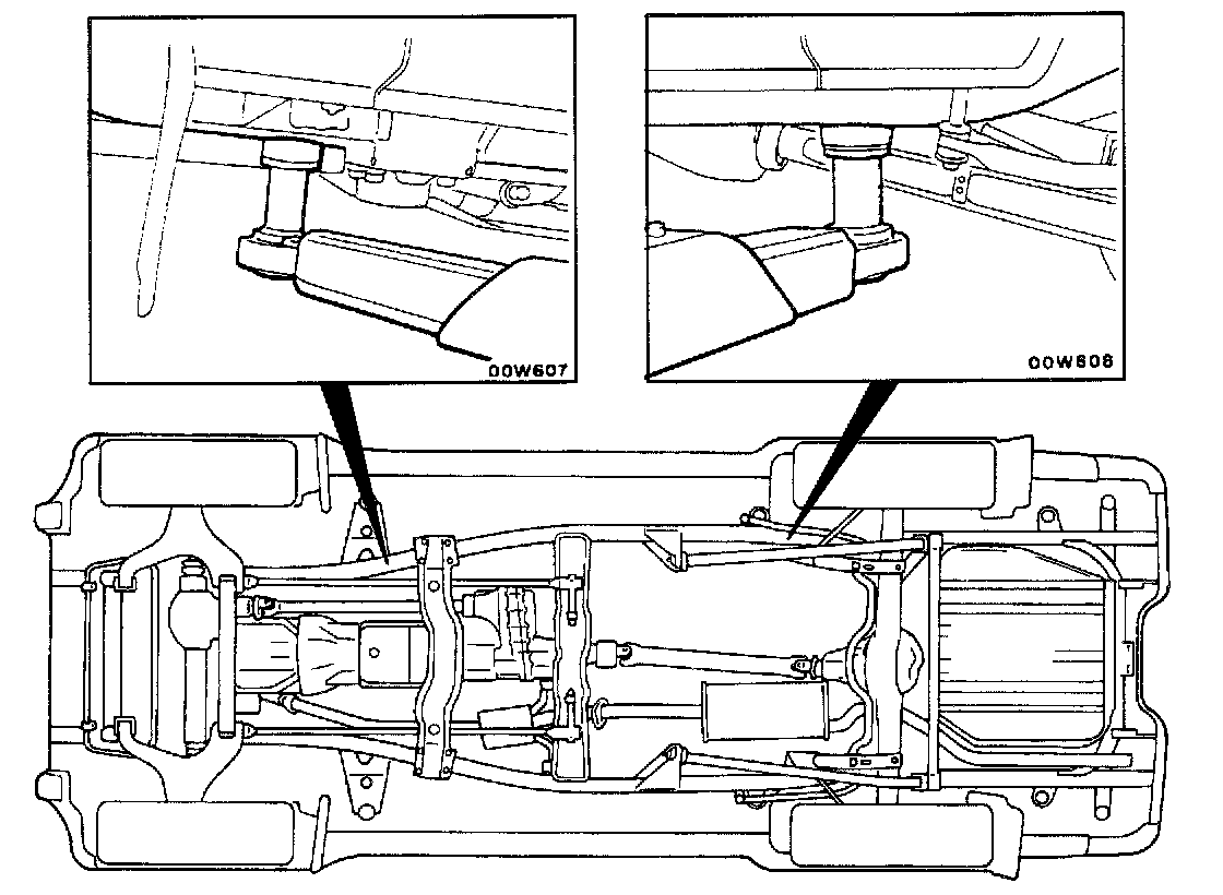 Jack receptacles are located at the No.2 cross member and rear axle housing to accept the jack supplied with the vehicle for emergency road service. Always block the opposite wheels and jack only on a level surface.