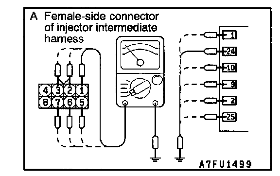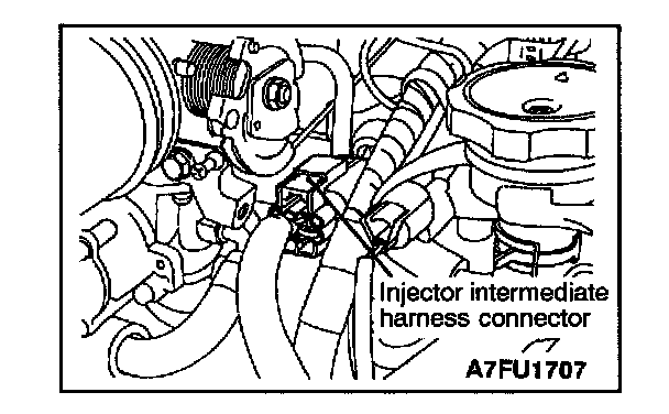 1. Disconnect the injector intermediate harness, and connect the special tool (harness connector MD998474).