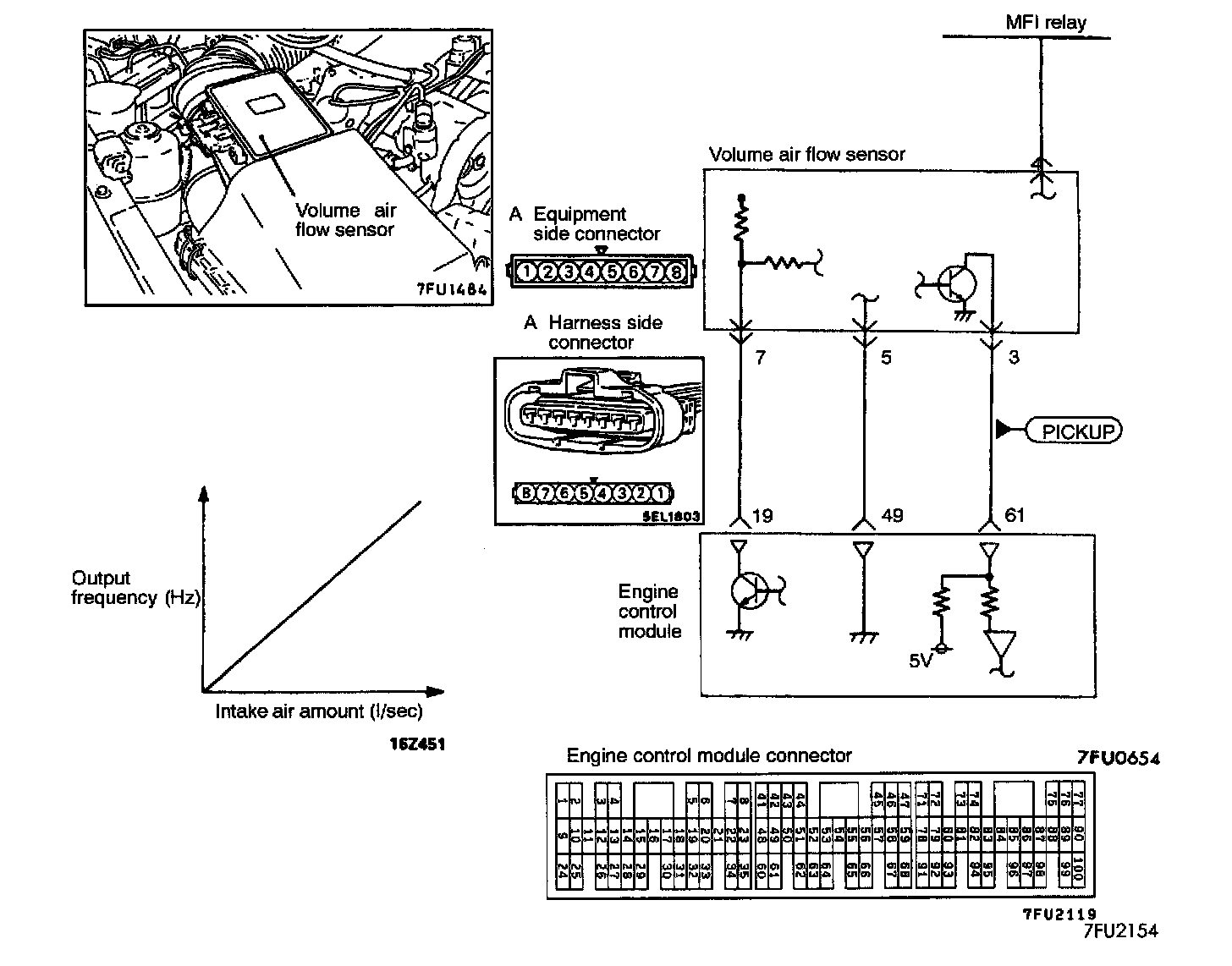 - The power for the volume air flow sensor is supplied from the MFI relay to the volume air flow sensor, and is grounded at the engine control module. The volume air flow sensor, by intermitting the flow of the 5 V voltage applied from the engine control module, produces pulse signals.