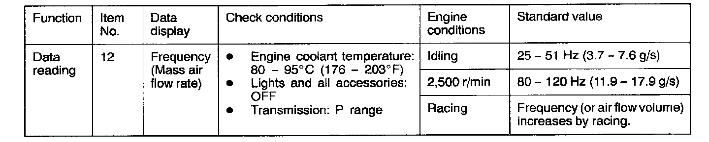 Hint 2: If the volume air flow sensor output frequency is any value other than zero when the ignition switch is switched ON (but the engine is not started), a malfunction of the volume air flow sensor or of the engine control module is the probable cause.