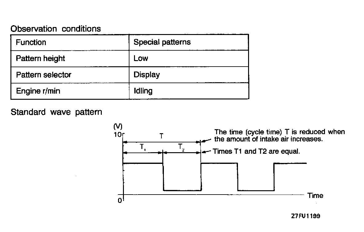 Unstable wave pattern with non-uniform frequency. However, when an ignition leak occurs during acceleration, the wave pattern will be distorted temporarily, even if the volume air flow sensor is normal.